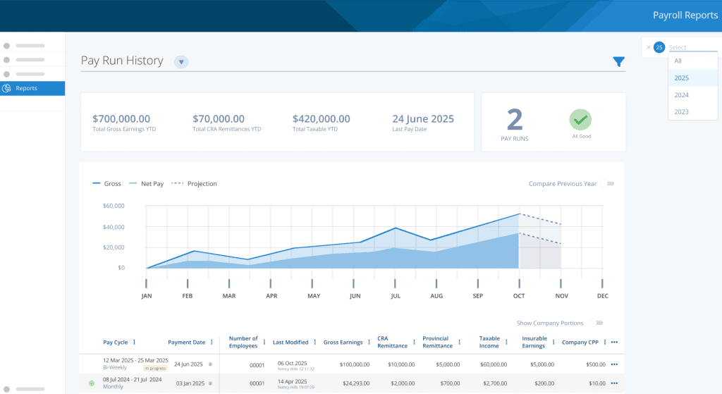 Cada transacción genera datos de nómina. Esto incluye registros de pago, confirmaciones de remesas y resúmenes de empleados, todo lo cual necesitarás para los T4 al final del año.
