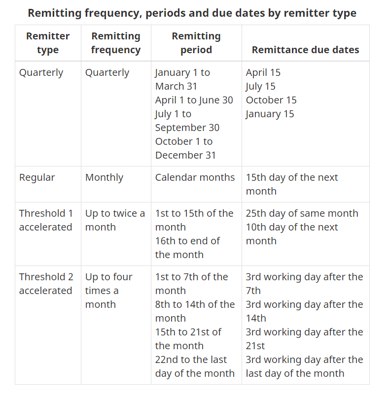 Si eres un remitente regular, la CRA debe recibir las deducciones a más tardar el día 15 del mes siguiente al mes en que se pagó a los empleados.