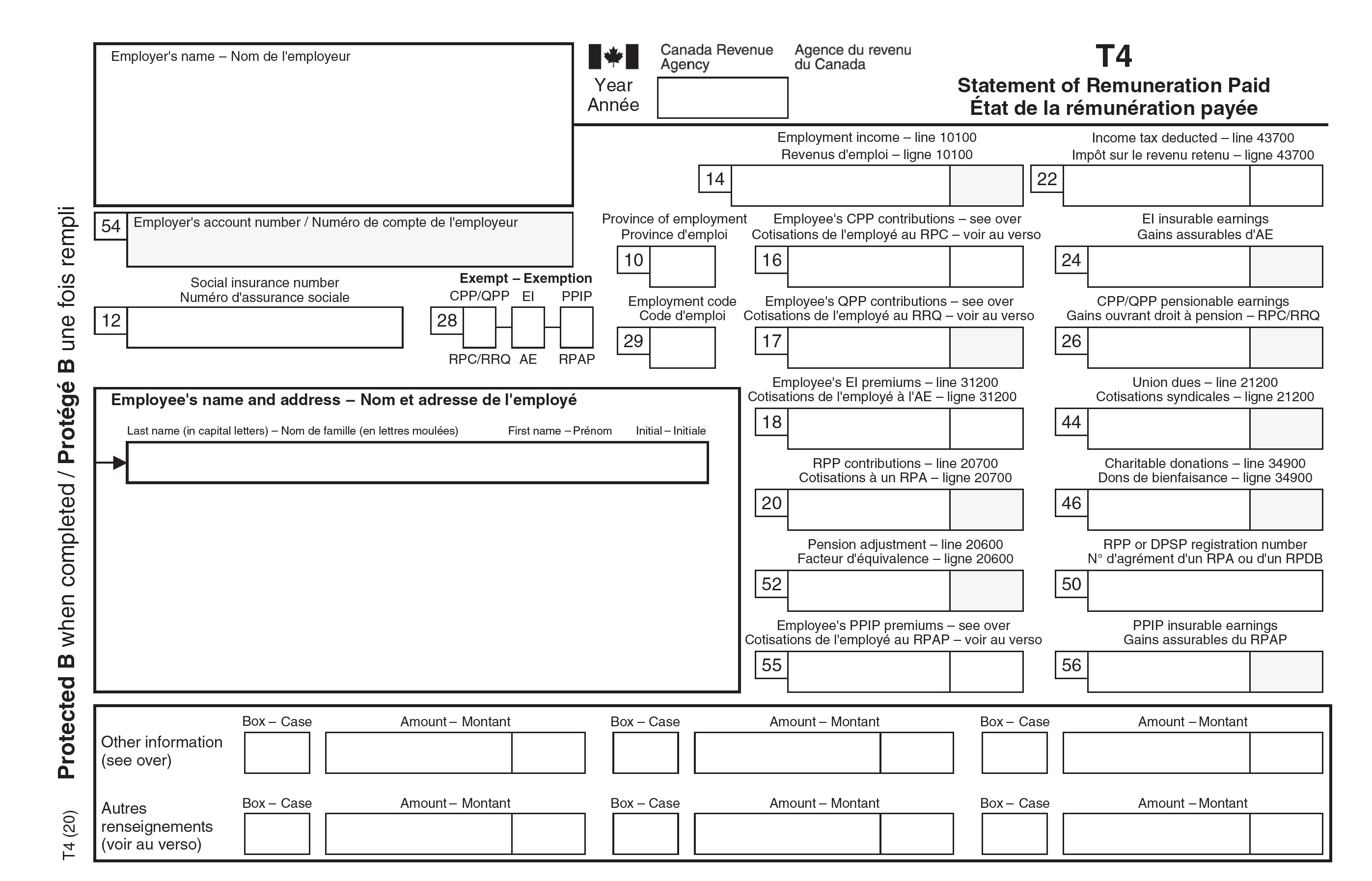 Les employeurs sont tenus de délivrer des feuillets T4 aux employés qui ont reçu des rémunérations (ou des revenus) au cours de l'année précédente. Ces feuillets sont ensuite utilisés par les employés pour leurs déclarations de revenus annuelles auprès de l'Agence du revenu du Canada (ARC).