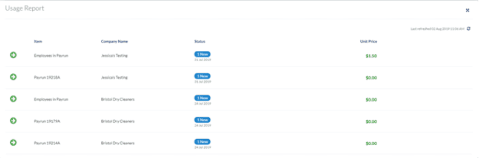 The EVOLV Usage Report shows your most recent billing activity broken down by client. This section displays the records of bills like ePay billing, amounts charged to run payroll or remittances, and more.