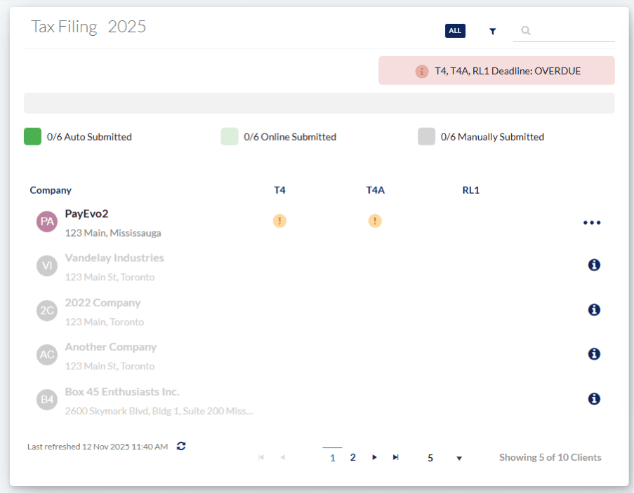 Track your year-end tax submission progress with the EVOLV Tax Filing tile. For each company, you can see if your submissions have been completed, along with exactly which documents you’ll need to submit.