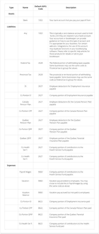 We adhere to the Canada Revenue Agency's guidance on account codes, the GIFI standard. The following descriptions will help you determine how to match Payroll's chart of accounts and general ledger codes to your bookkeeping system. You can update any of our codes to match your Chart of Account codes if necessary.