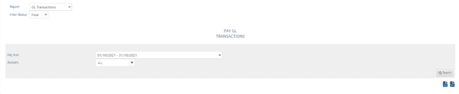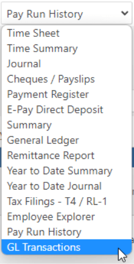 Once you complete your payroll, go to Reports and open any report. Then from the report drop-down menu you can select the GL Transactions Report and use the search options to find what you need. This report can be exported into Excel or PDF.