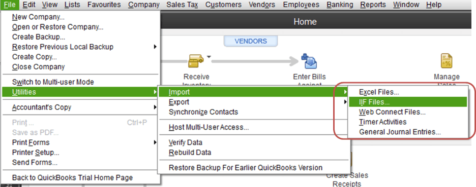 Launch QuickBooks and navigate to FILE -> UTILITIES -> IMPORT -> IIF FILES