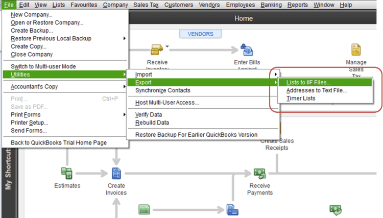 Launch QuickBooks, go to FILE -> UTILITIES -> EXPORT -> LISTS TO IIF FILES