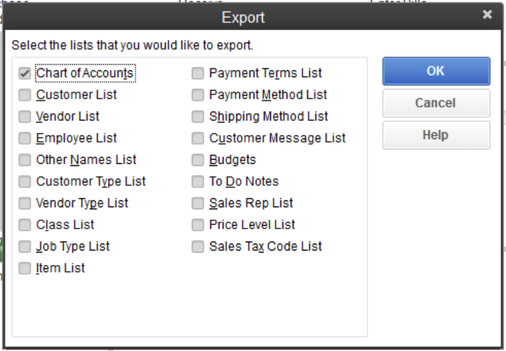 b. Now select the list you wish to export; in our case this is your Chart of Accounts.