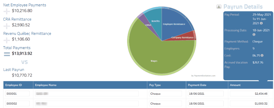 Note: the Total Payments figure includes the employees’ net pay and remittances. This will sometimes differ from the Cost figure on the right, as Cost also includes any non-cash benefits and accrued vacation. So, if you see a discrepancy between these two amounts, be sure to check for anything that isn’t debited from the account, such as accrued vacation and non-cash benefits.