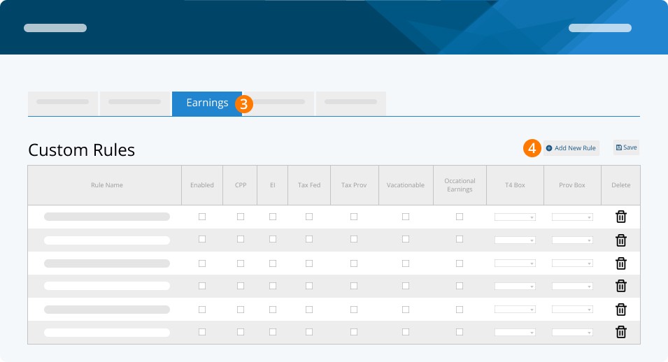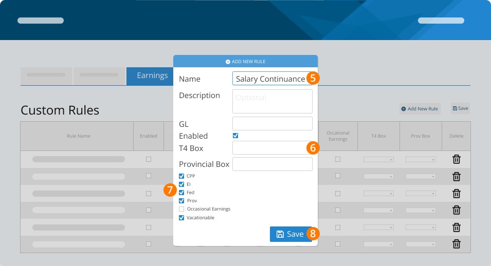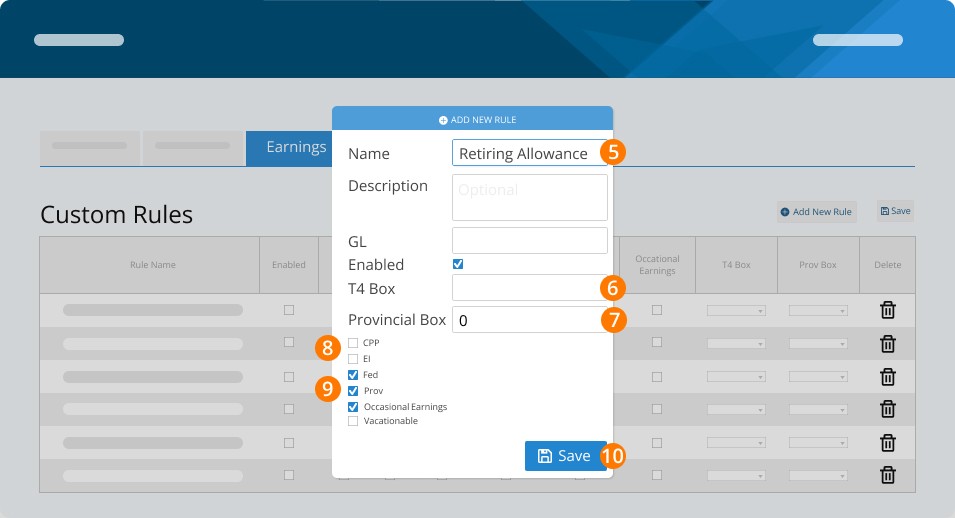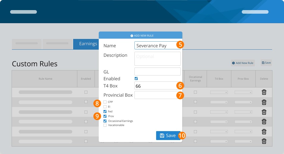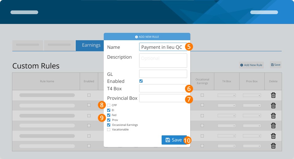 Step 7. CHECK CPP, EI, FEDERAL TAX, PROVINCIAL TAX, OCCASIONAL EARNINGS, and VACATIONABLE (this rule is subject to vacation pay in all Provinces and Territories aside from Newfoundland and Labrador and Alberta).