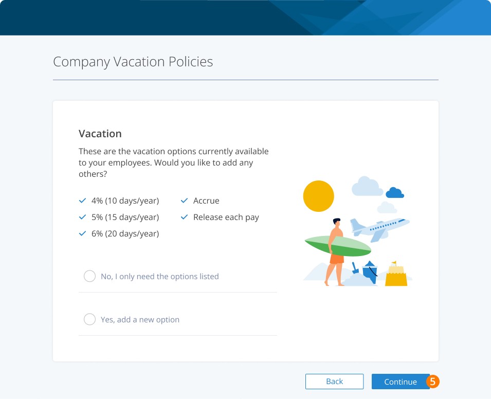 Step 5. Now, let's set your vacation policies. You can use the standard policies we've created or add your own.
