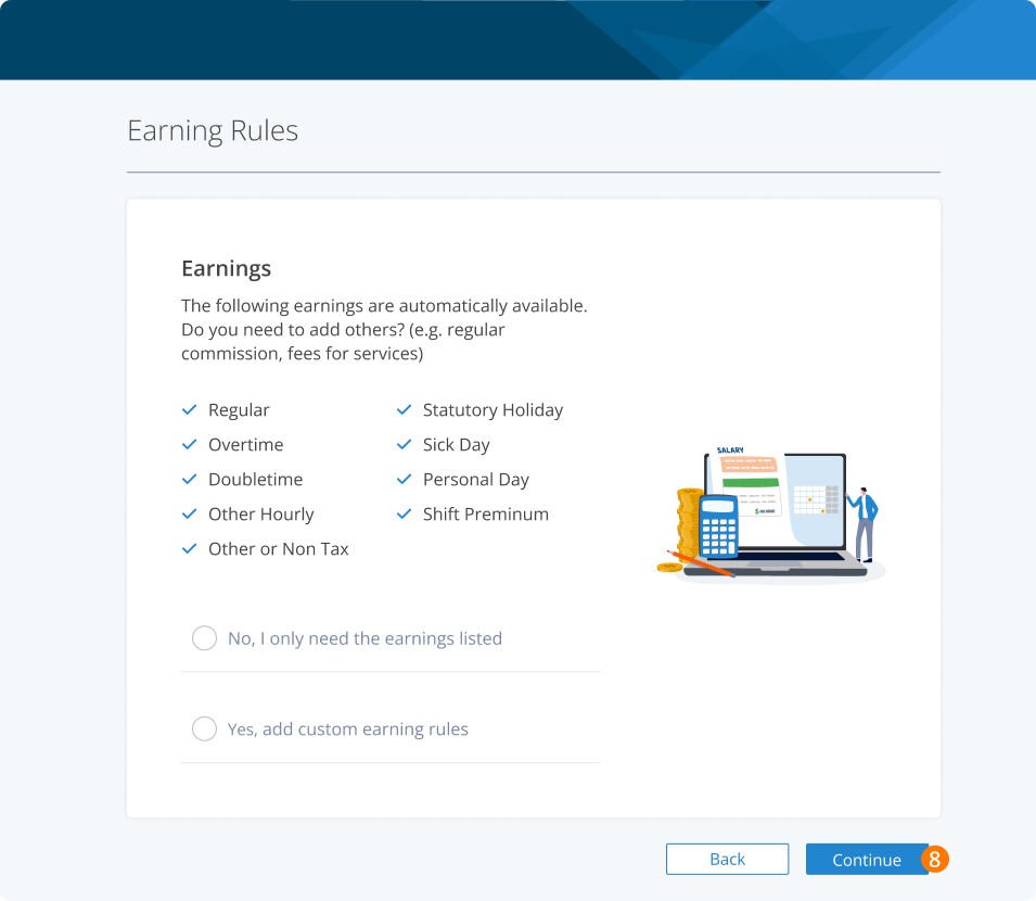 Step 8. Finally, you can set up your employees' earnings. We'll have a list you can automatically apply, and as always, you can create your own.