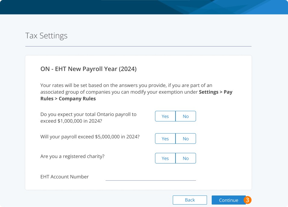 Step 3. Here, you'll set your Ontario employer health tax (EHT) rates. For a full Ontario EHT walkthrough, check out our guide.