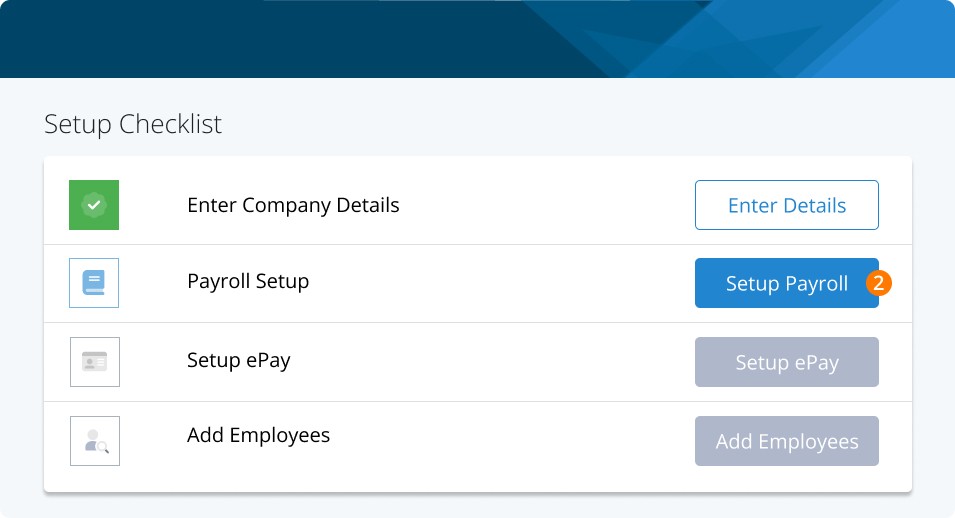 Step 2. Now, you'll see this checklist. It outlines your next steps and shows what you've completed. Click Set Up Payroll.
