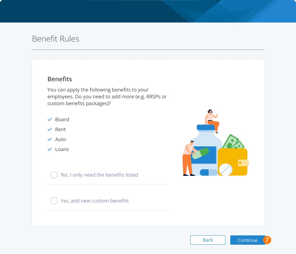 Step 7. And here, you'll add employee benefits. You can use the benefits you see on screen or add your own custom rules.