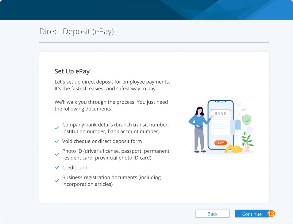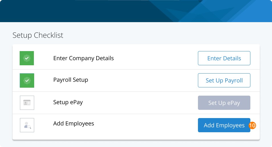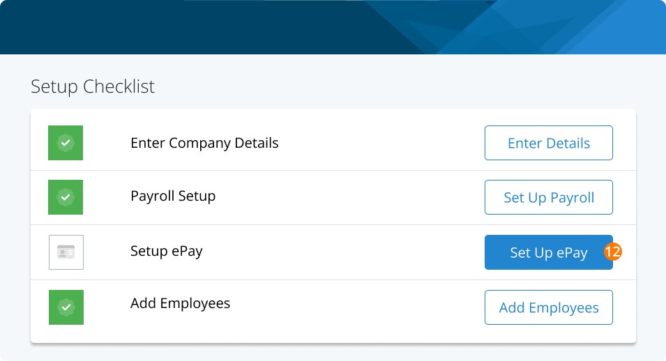 Step 12. Finally, all we need to do is set up direct deposit. It's the easiest, fastest, and most secure way to pay your team. So, let's go back to the checklist and select Set Up ePay.