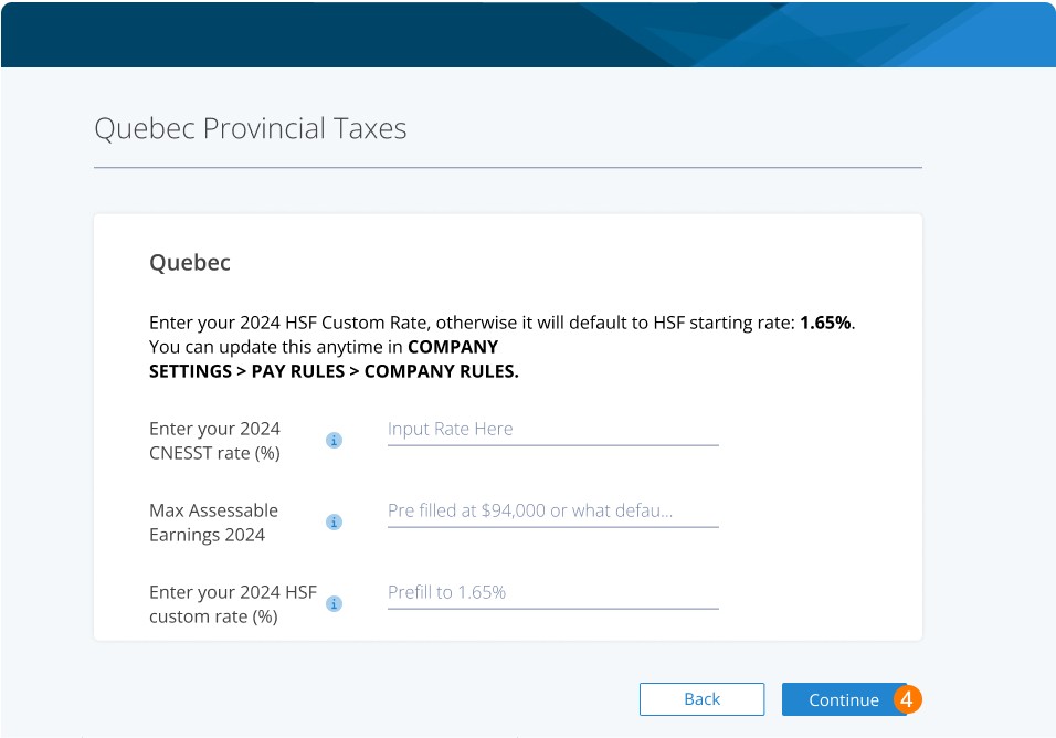 Step 4. Next, you'll set your Quebec tax settings. For a full guide on Quebec payroll taxes, check out our guide here.